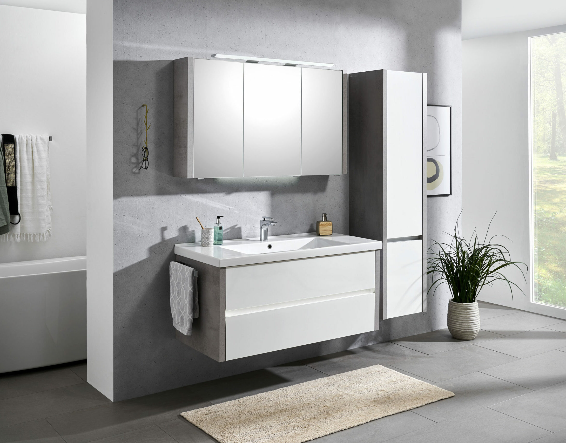 Armoire de toilette 3 portes avec boitier prise et interrupteur. Plan de toilette en céramique et prise de main. Finition Blanc Alpin Brillant et Oxyde Gris Clair.