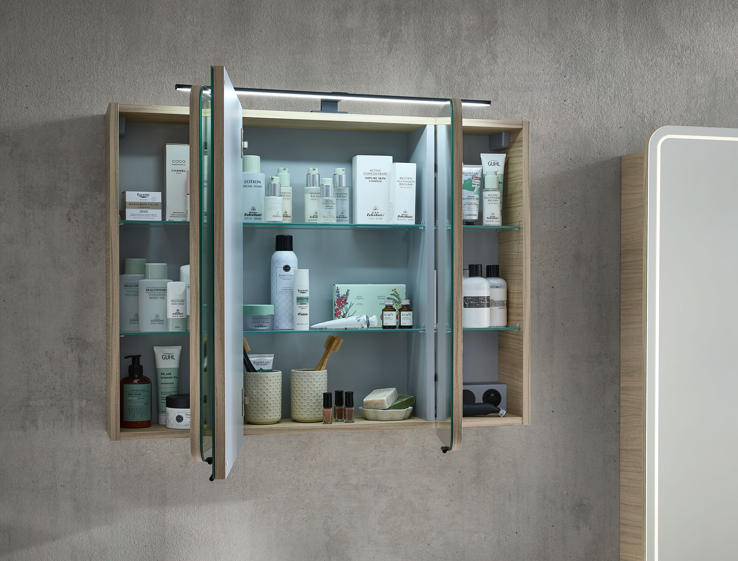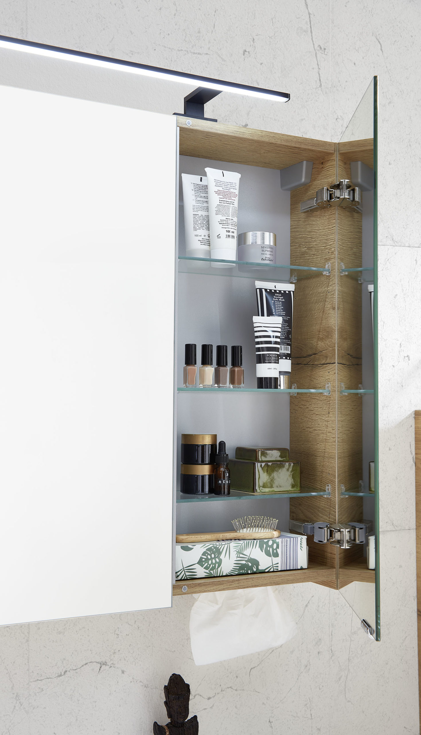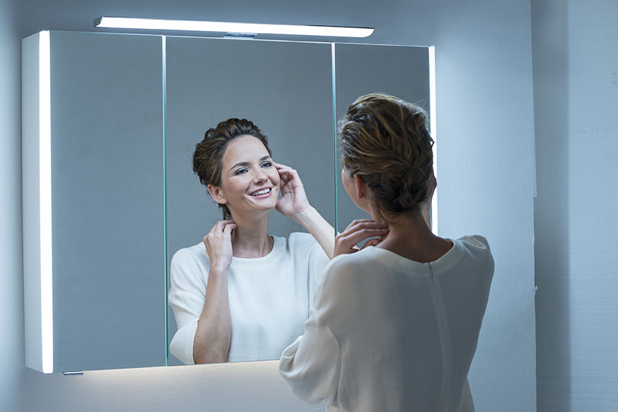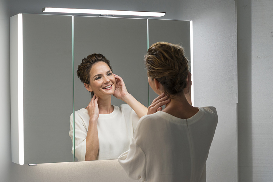 Révolutionnaire, la nouvelle technologie innovante Led Plus permet de choisir ou mixer le type de couleur (jaune ou blanche) de la lumière perçue et de sélectionner la température désirée (chaude ou froide) et d’en régler l’intensité. Associés au meuble de bain, l’armoire de toilette ou le panneau miroir Led PLus, un dispositif de contact, type interrupteur sensitif, sélectionne, d’un simple toucher, la lumière de 3 manières différentes.
