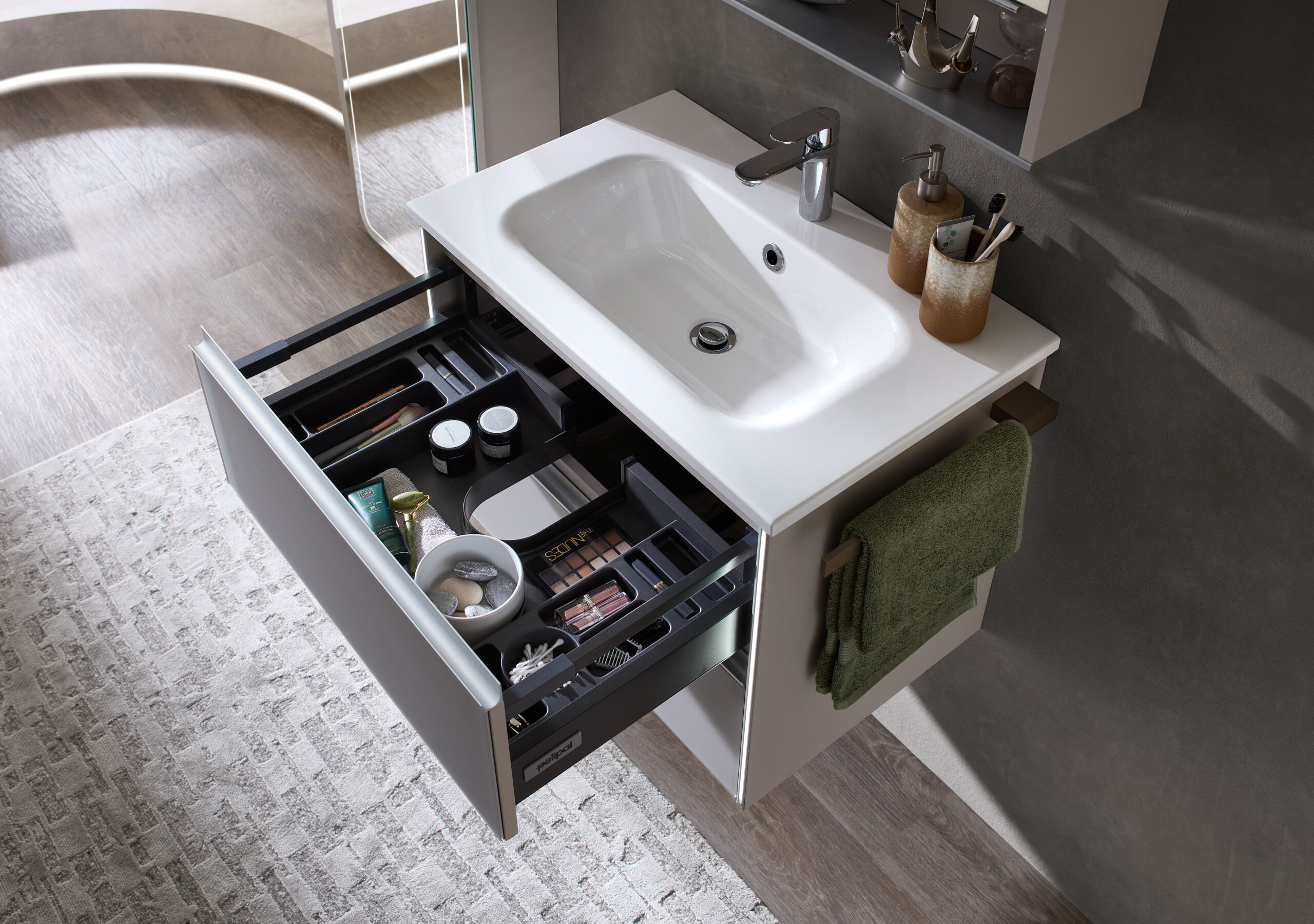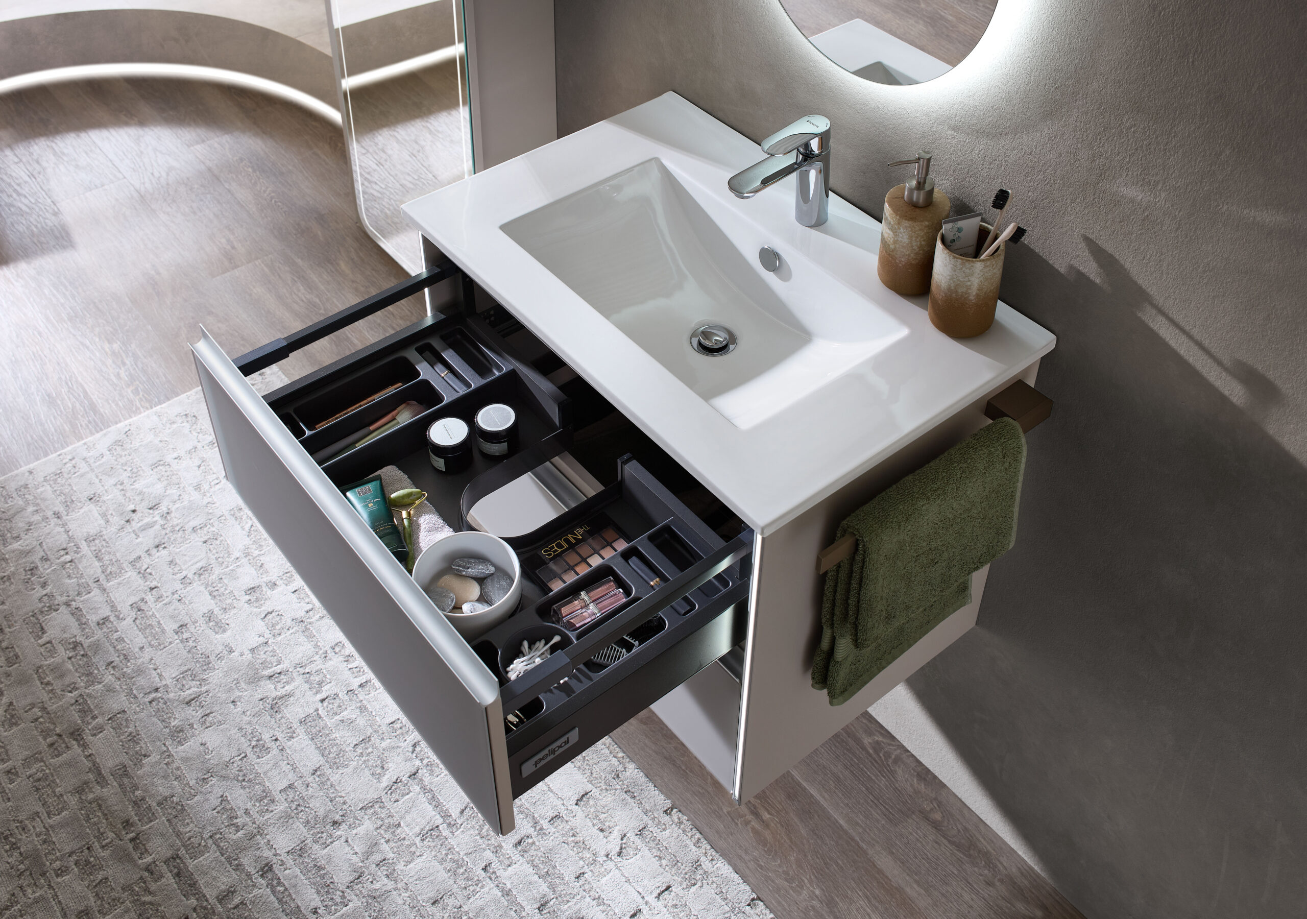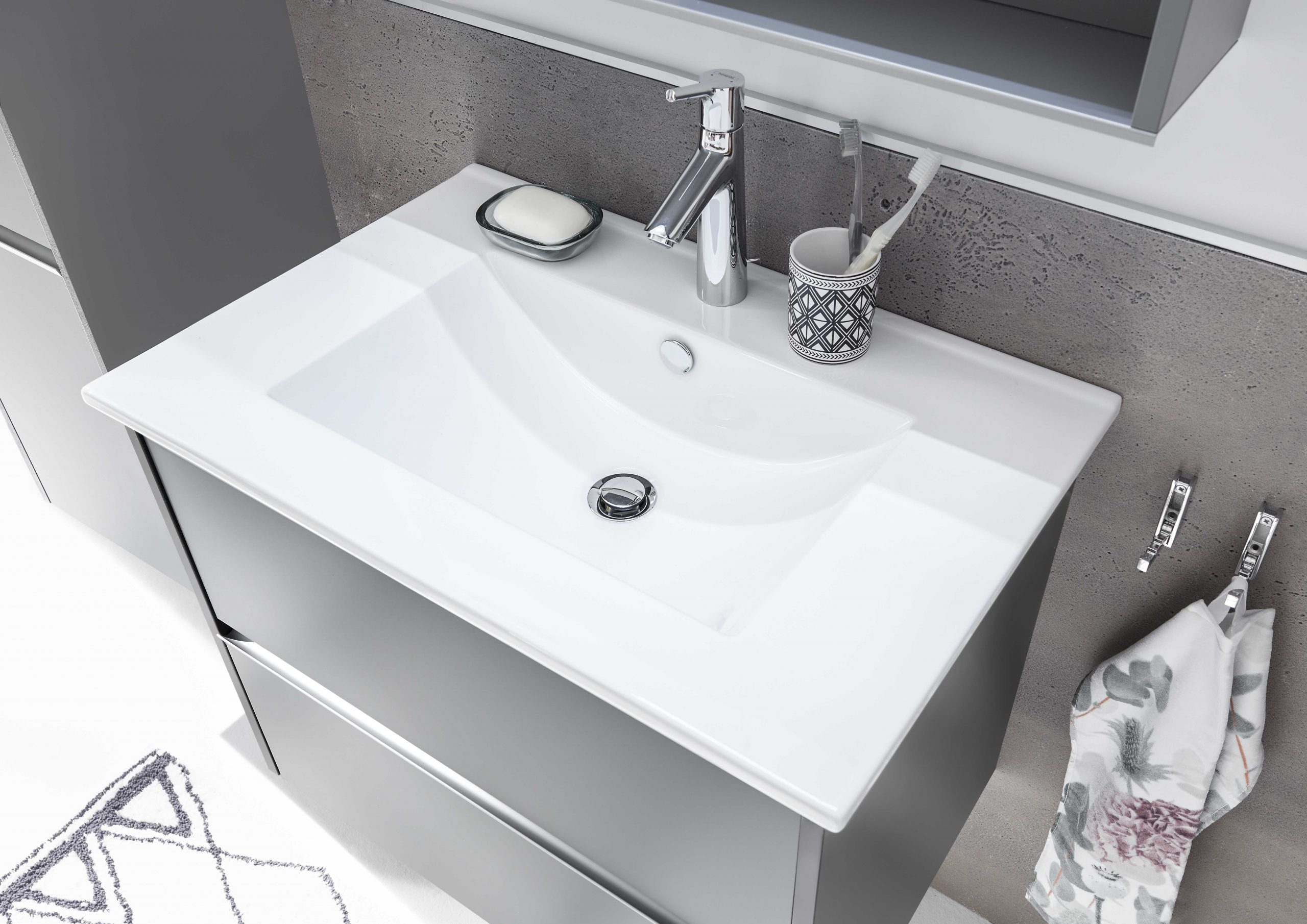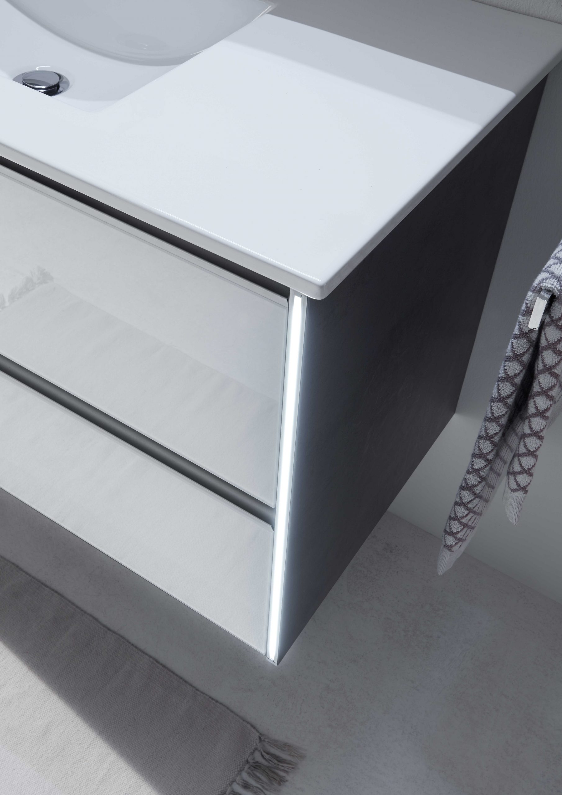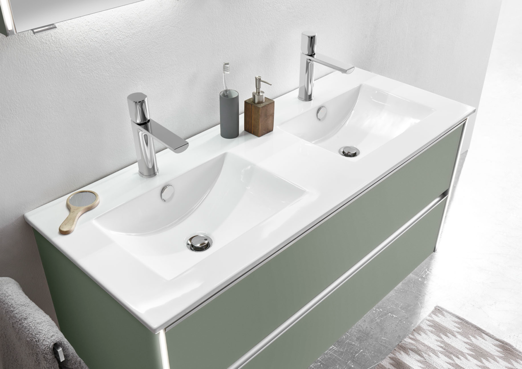 Disponible en 4 largeurs (Simple vasques : 71, 101 & 121 cm / Double vasque : 121 cm). Plan de toilette en marbre reconstitué ou céramique.