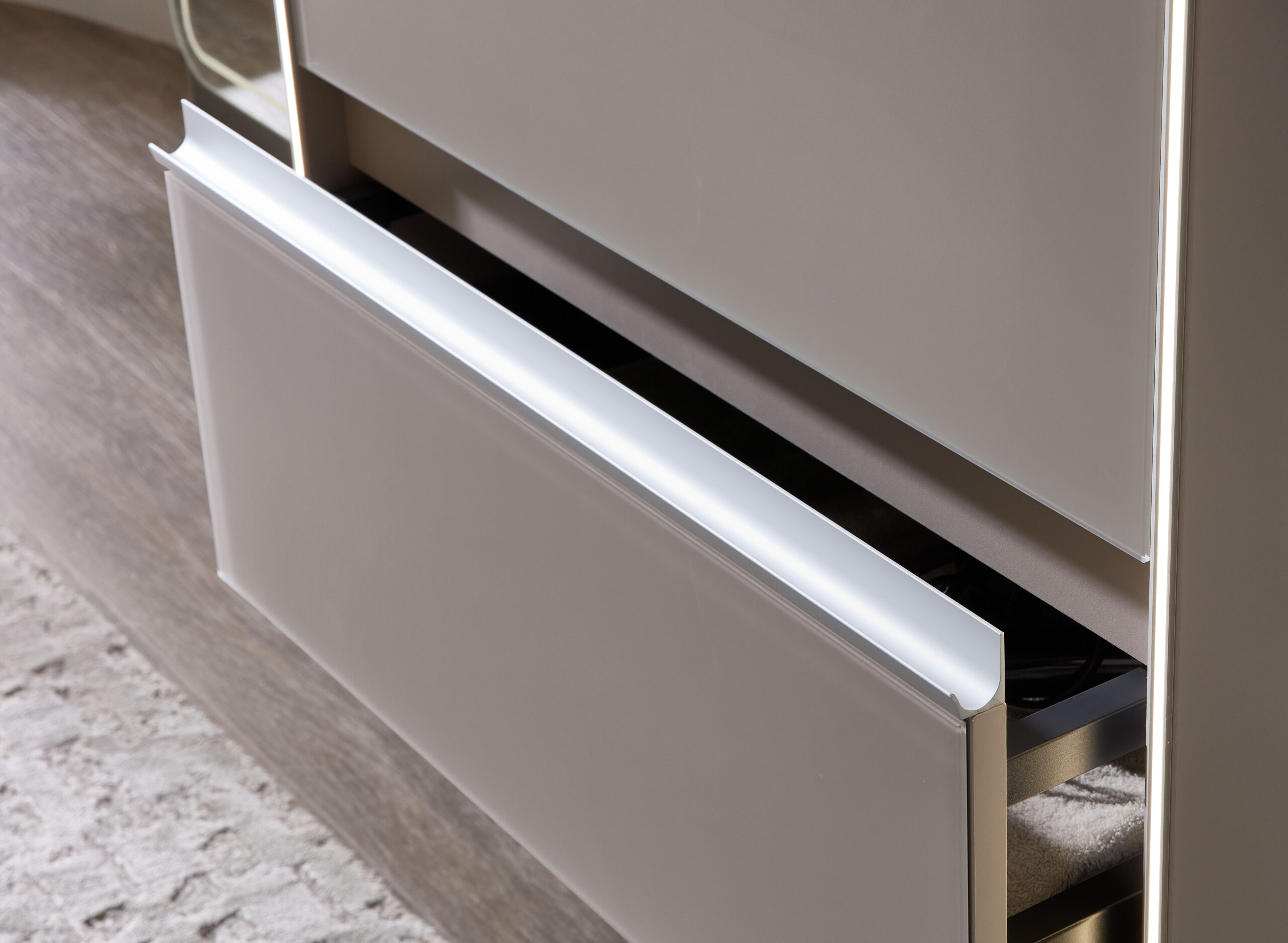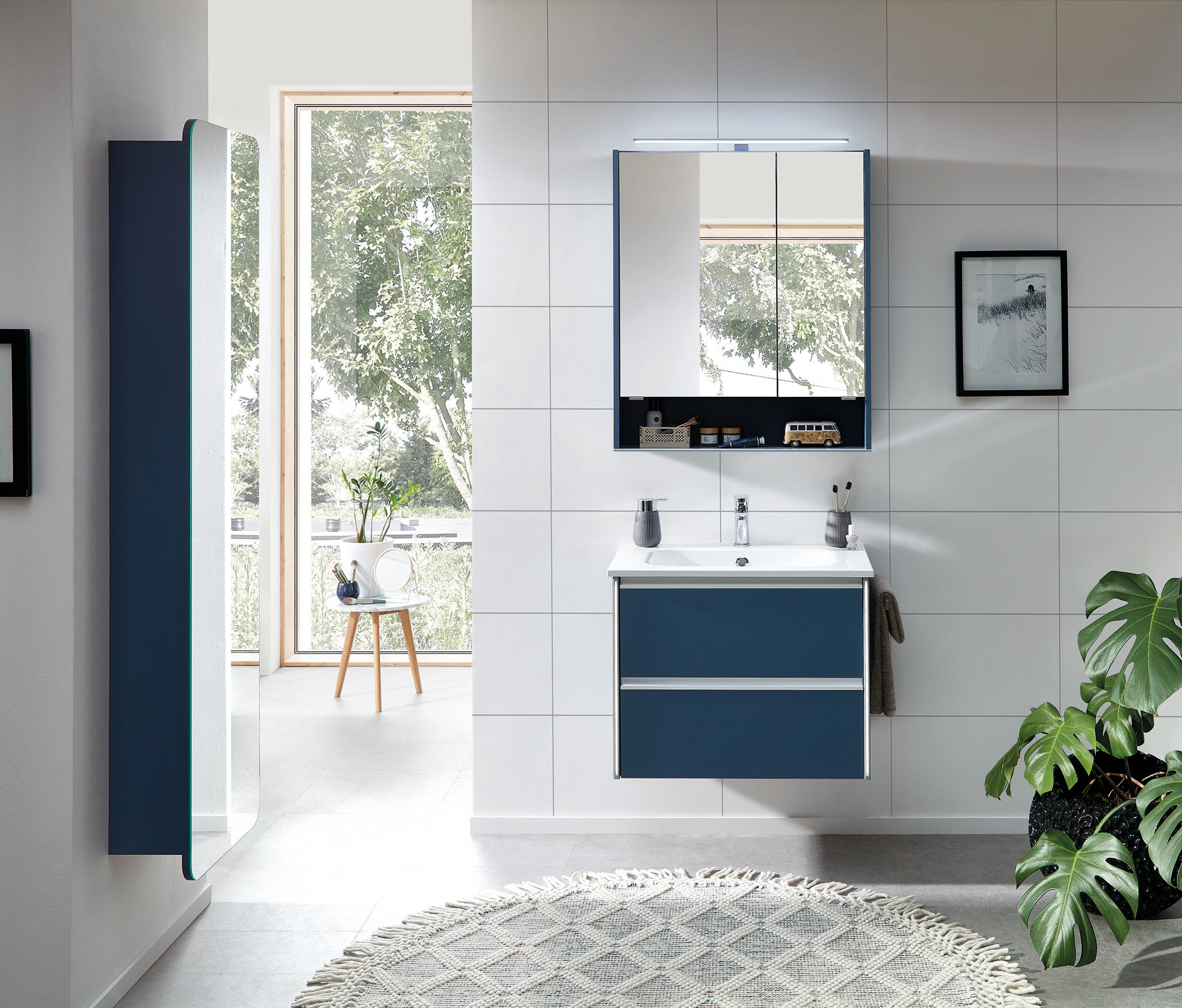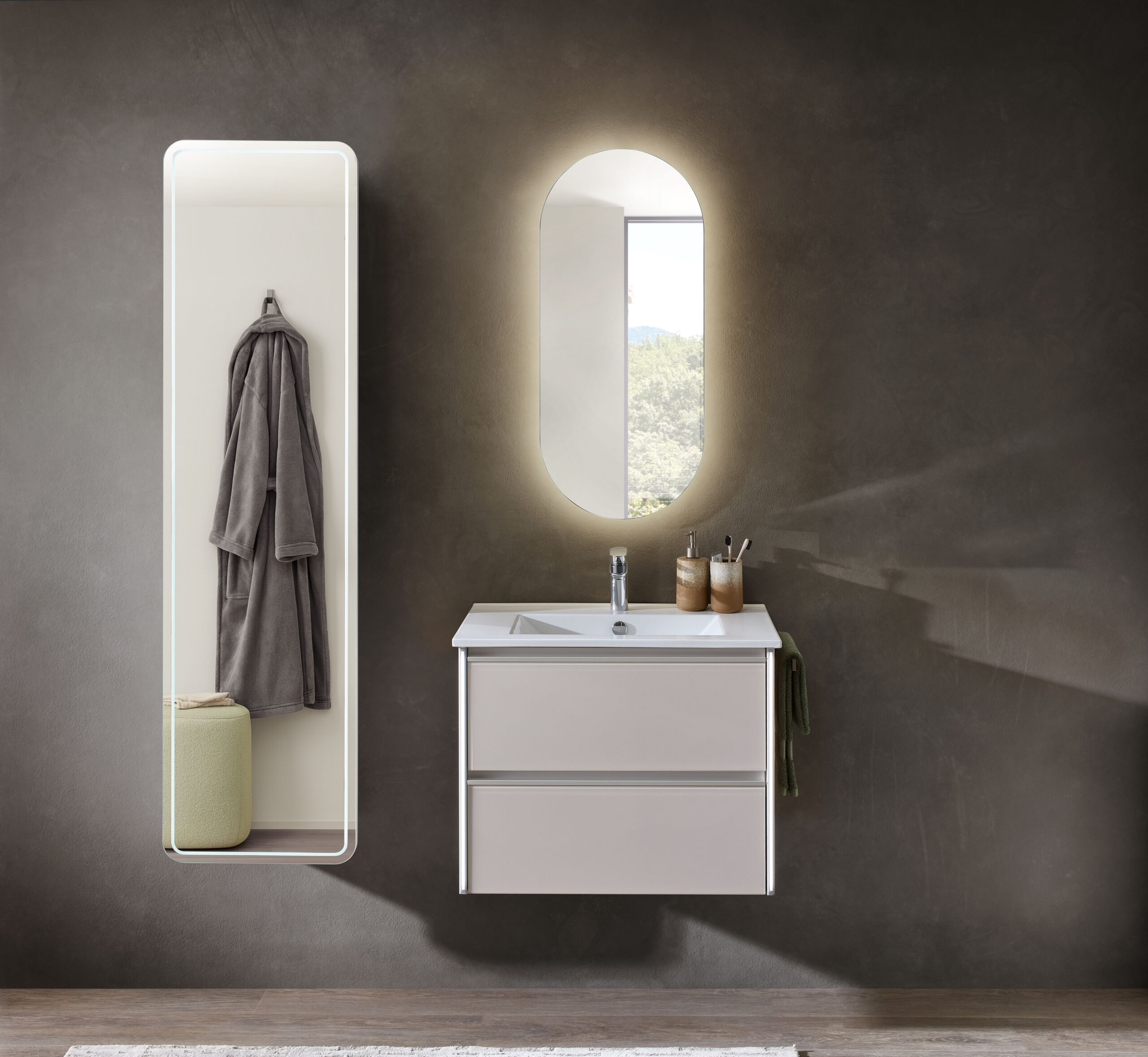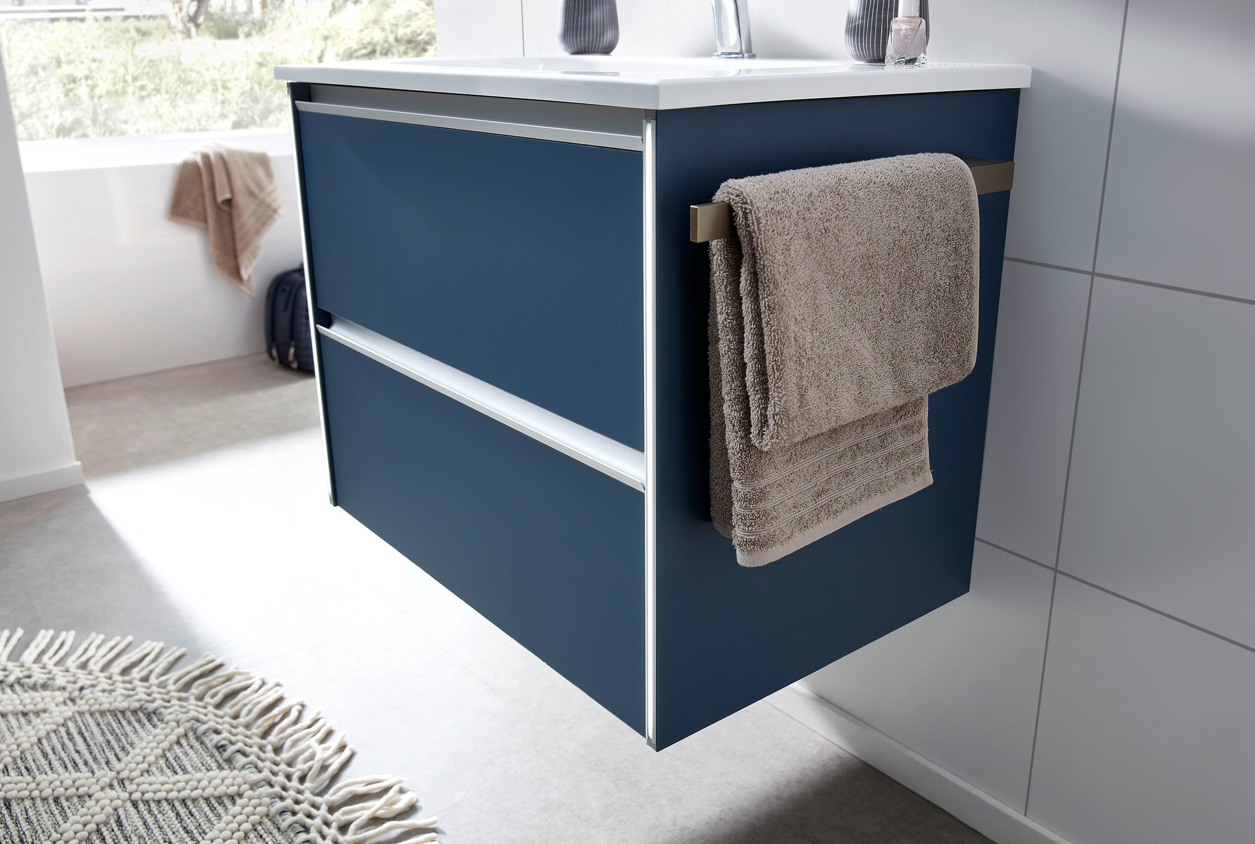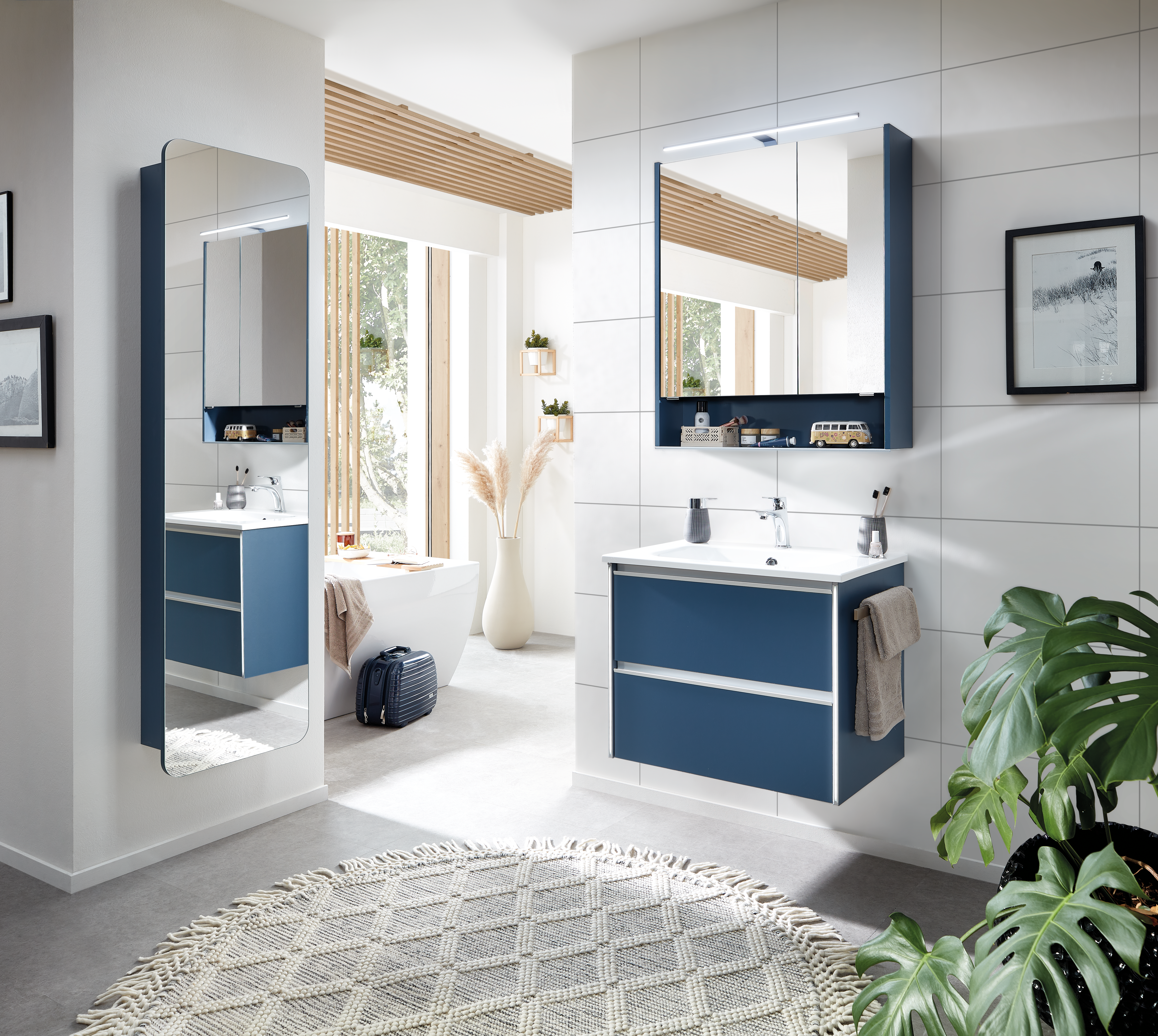 Disponible en 4 largeurs (Simple vasques : 71, 101 & 121 cm / Double vasque : 121 cm). Plan de toilette en marbre reconstitué ou céramique.